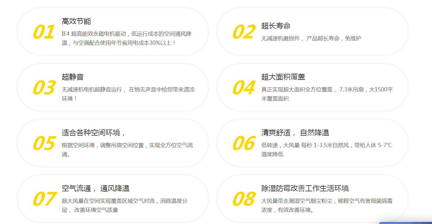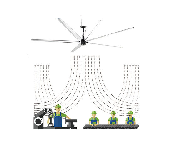 工业大风扇结合了空气动力学、传动力学、脉宽调制控制技术、机械力学、仿真模拟技术、通讯控制、工业设计等一系列综合学科的前沿技术。翼形扇叶仅用1.5kw即可带动1900㎡气流,形成锥形气流层,实现通风降温的双重功能。